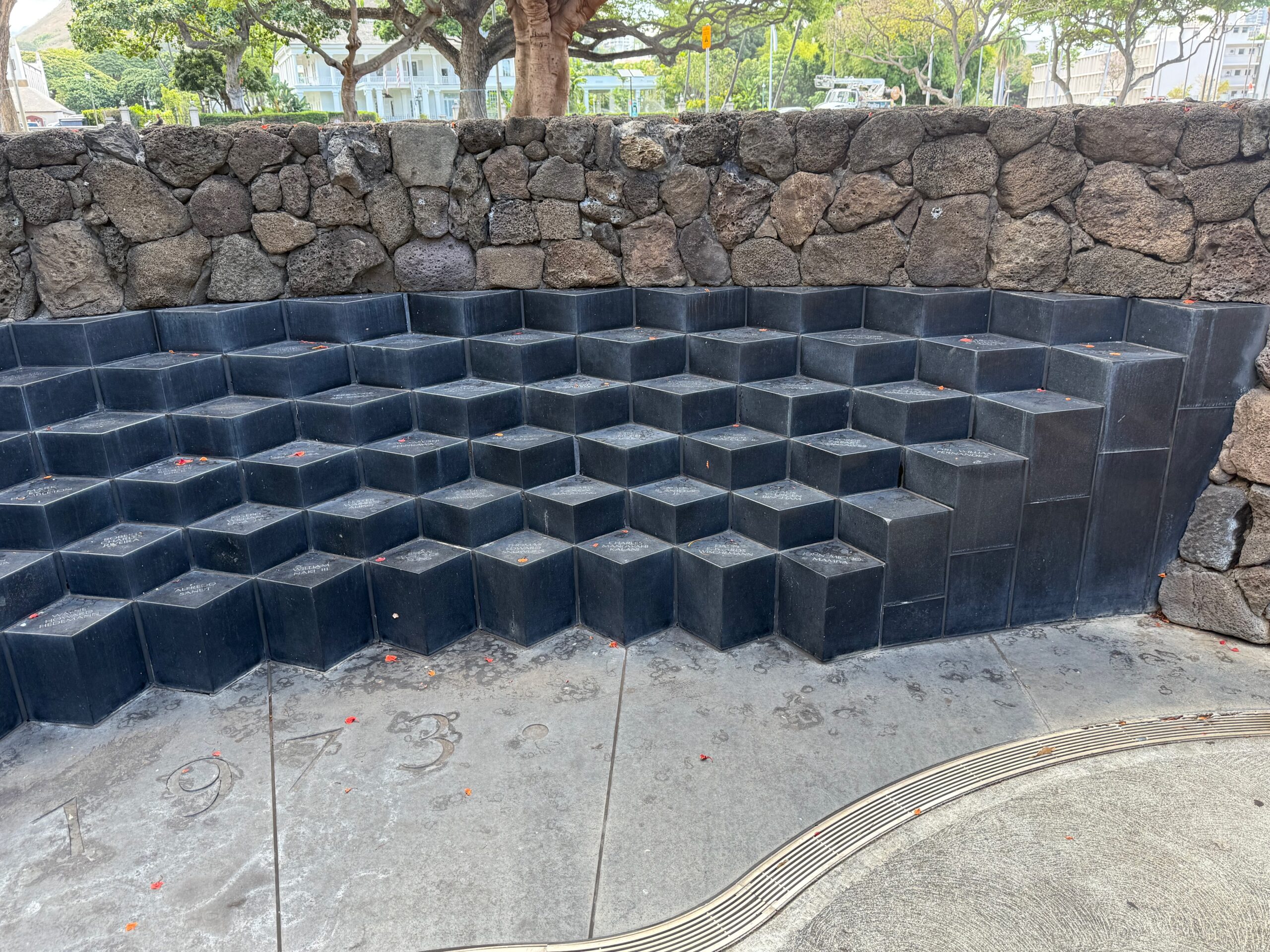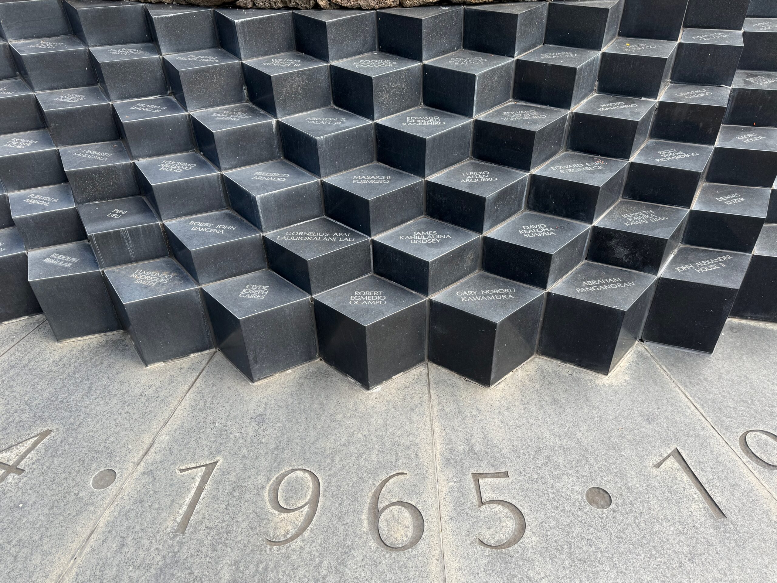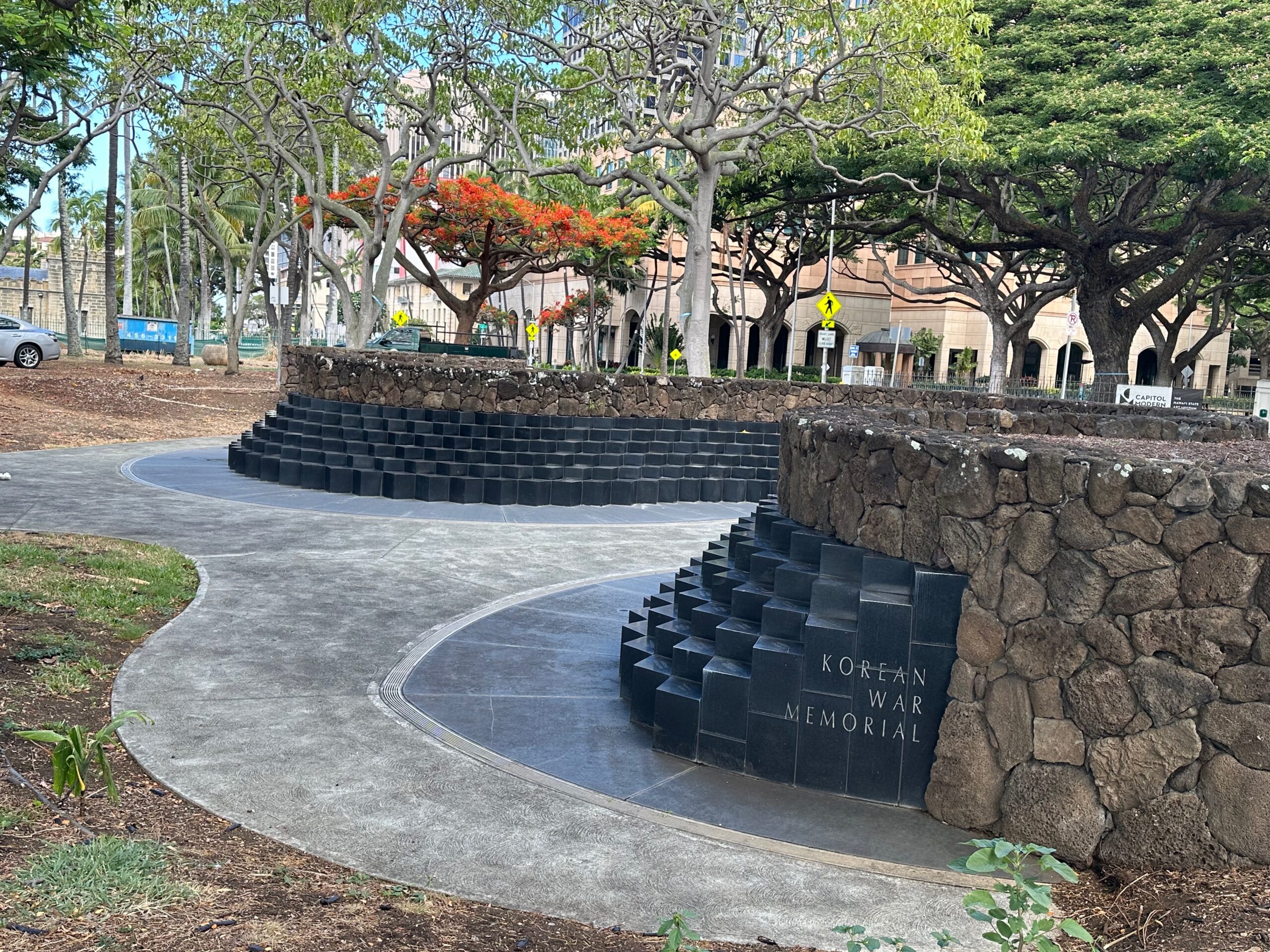 The Korean and Vietnam War Memorial, built at a cost of one million dollars, was dedicated on July 24, 1994. The design consists of two winding walls of terraced granite pedestals – one for each war – inscribed with the names of those killed or missing in action. Each pedestal bears the engraved names of the Hawai‘i men who died in the two conflicts. By allowing visitors to reach out and touch individual pedestals, the design offers an opportunity to make a personal connection with those who fought – a connection that heals and enlightens. The memorials wind through the years, revealing more names around each bend and marking time in the toll of human lives. The sunken courtyard represents the descent into the anguish of war. The ascending pedestals, consisting of individual service men marching five abreast, from a moss rock wall, provide a vehicle for rising up and out from despair into a future secured by the sacrifices of those whose names are inscribed on them.
