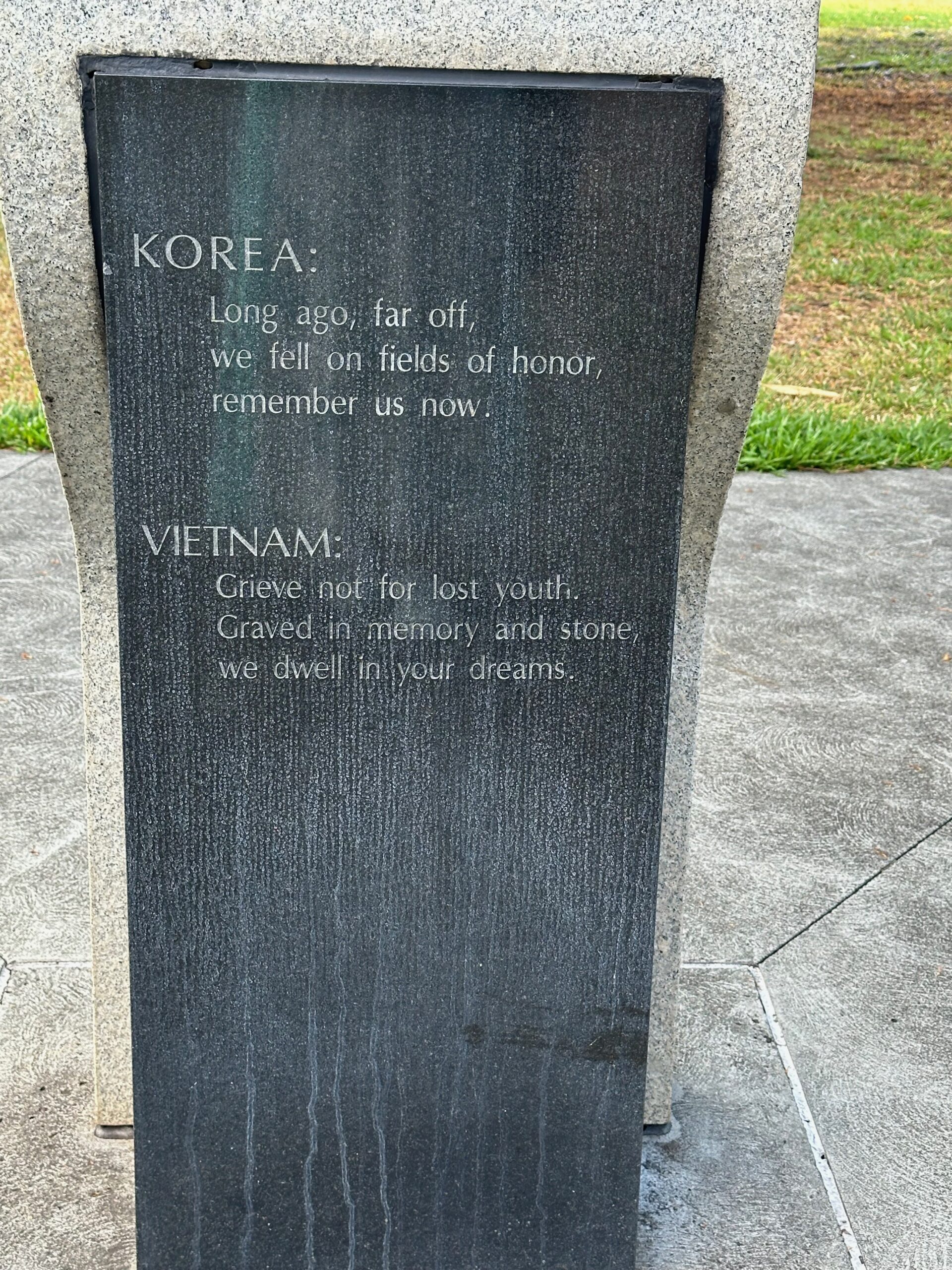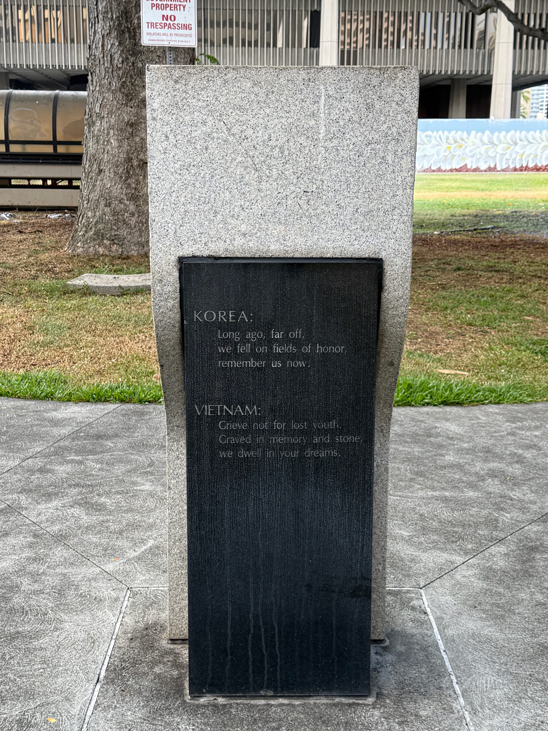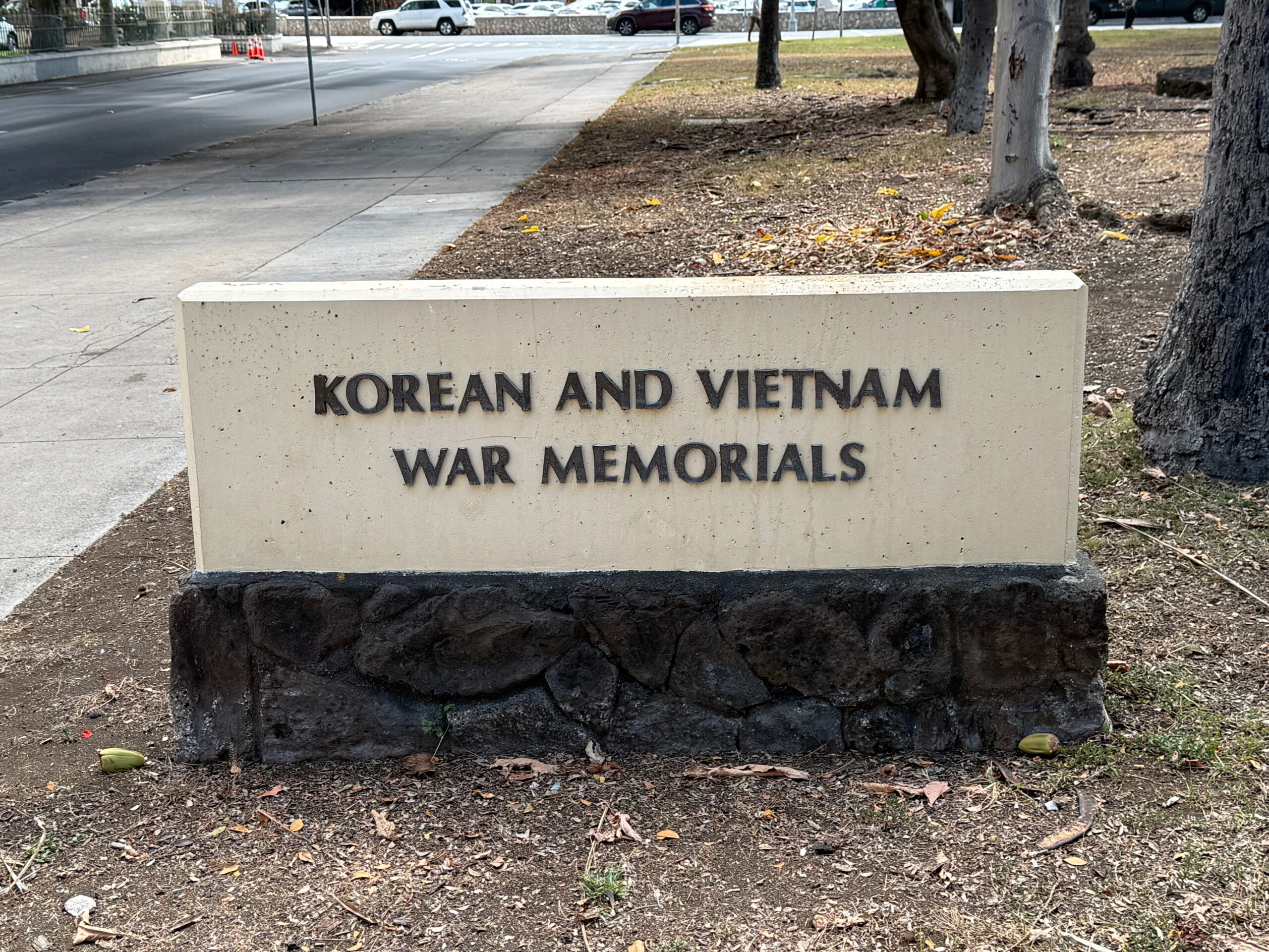 The Korean and Vietnam War Memorial, built at a cost of one million dollars, was dedicated on July 24, 1994. The design consists of two winding walls of terraced granite pedestals – one for each war – inscribed with the names of those killed or missing in action. Each pedestal bears the engraved names of the Hawai‘i men who died in the two conflicts. By allowing visitors to reach out and touch individual pedestals, the design offers an opportunity to make a personal connection with those who fought – a connection that heals and enlightens. The memorials wind through the years, revealing more names around each bend and marking time in the toll of human lives. The sunken courtyard represents the descent into the anguish of war. The ascending pedestals, consisting of individual service men marching five abreast, from a moss rock wall, provide a vehicle for rising up and out from despair into a future secured by the sacrifices of those whose names are inscribed on them.